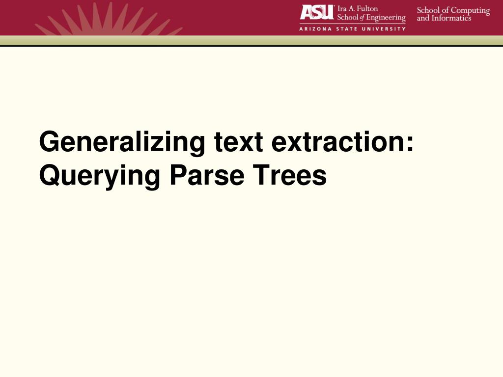 What’s needed for extraction? • To minimize reprocessing, we need to store parse trees and semantic information • a database is ideal to store information that we need to perform extraction • Extraction should be seen as generic • Can we use database queries as information extraction? • Hard to express syntactic patterns with SQL • We need a new query language for extraction, called parse tree query language (PTQL)