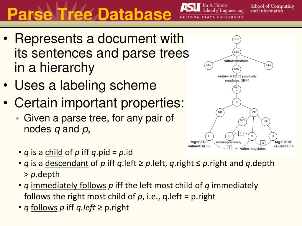 Parse Tree Database • Represents a document with its sentences and parse trees in a hierarchy • Uses a labeling scheme • Certain important properties: • Given a parse tree, for any pair of nodes q and p, • q is a child of p iff q.pid = p.id • q is a descendant of p iff q.left ≥ p.left, q.right ≤ p.right and q.depth > p.depth • qimmediately followsp iff the left most child of q immediately follows the right most child of p, i.e., q.left = p.right • qfollowsp iff q.left ≥ p.right