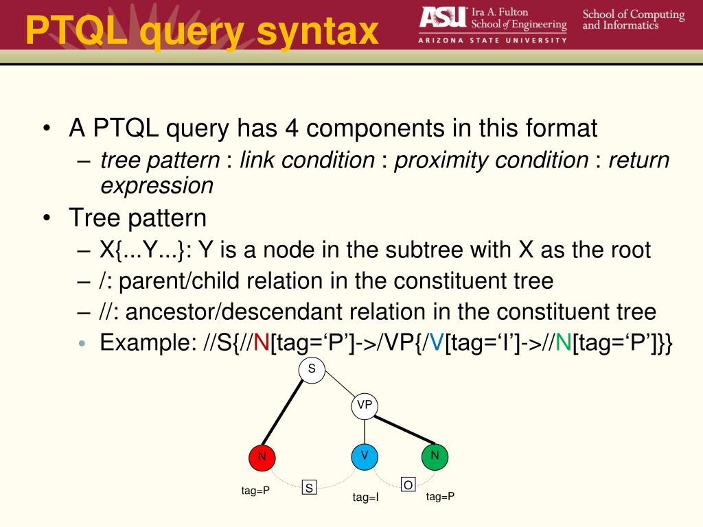 PTQL query syntax • A PTQL query has 4 components in this format • tree pattern : link condition : proximity condition : return expression • Tree pattern • X{...Y...}: Y is a node in the subtree with X as the root • /: parent/child relation in the constituent tree • //: ancestor/descendant relation in the constituent tree • Example: //S{//N[tag=‘P’]->/VP{/V[tag=‘I’]->//N[tag=‘P’]}} S VP V N N O tag=P S tag=I tag=P