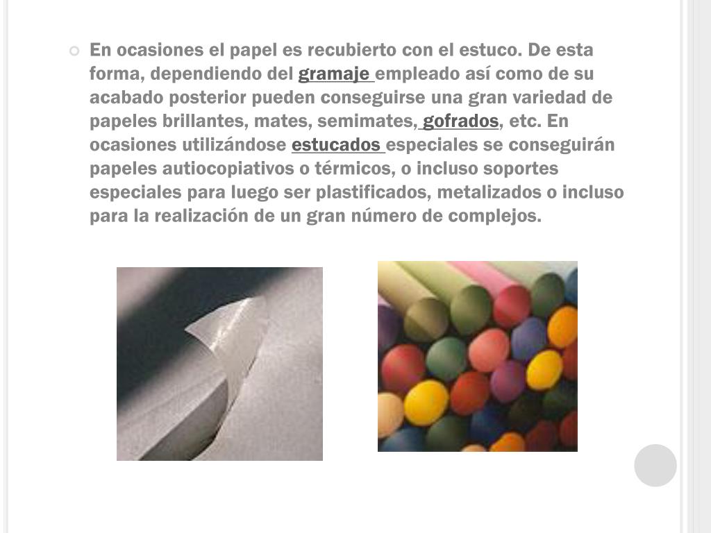 ¿ QUE ES EL ESTUCADO? • Soportes recubiertos de un revestimiento de partículas minerales unidas entre si y al soporte. Los papeles estucados pueden clasificarse de la siguiente forma: • Estucados ligeros Es aplicada la capa de estucado en la maquina de papel. Aplicación de bajo gramaje de capa. Pueden ser brillantes o mates. • Estucados industriales Papeles en los que se aplica una o varias capas de estucado en maquina estucadora. Se utilizan como soporte otros papeles preestucados. Pueden existir en calidad brillante, semimate y mate. Estos dos últimos se presentan estucados por las dos caras, mientras que el brillante puede ser estucado por las dos caras o solamente por una. Pueden además ser gofrados.