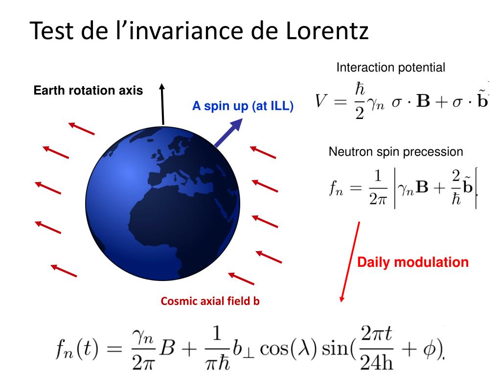 Test de l’invariance de Lorentz Interaction potential Earth rotation axis A spin up (at ILL) Neutron spin precession Daily modulation Cosmic axial field b