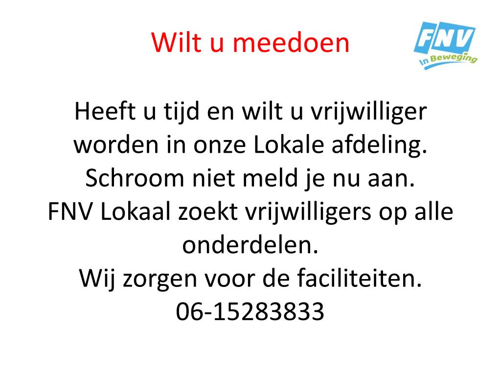 Wilt u meedoenHeeft u tijd en wilt u vrijwilliger worden in onze Lokale afdeling. Schroomniet meld je nu aan.FNV Lokaal zoekt vrijwilligers op alleonderdelen.Wij zorgen voor de faciliteiten.06-15283833