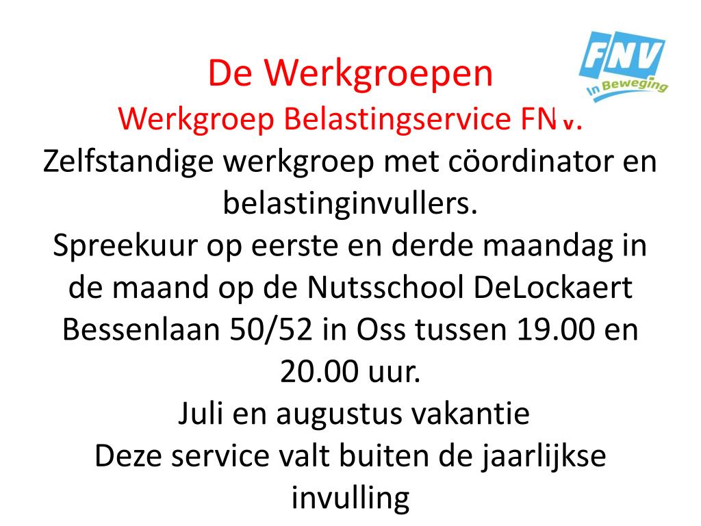 De WerkgroepenWerkgroep Belastingservice FNV. Zelfstandige werkgroep met cöordinator en belastinginvullers.Spreekuur op eerste en derdemaandag in de maand op de NutsschoolDeLockaertBessenlaan 50/52 in Oss tussen 19.00 en 20.00 uur.Juli en augustusvakantieDeze service valt buiten de jaarlijkseinvulling