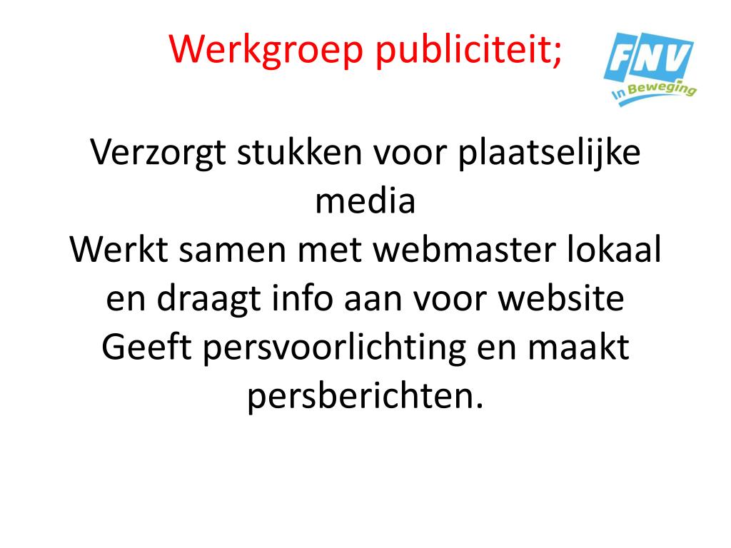 Werkgroep publiciteit;Verzorgtstukken voor plaatselijke mediaWerkt samen met webmaster lokaal en draagt info aan voor websiteGeeft persvoorlichting en maaktpersberichten.