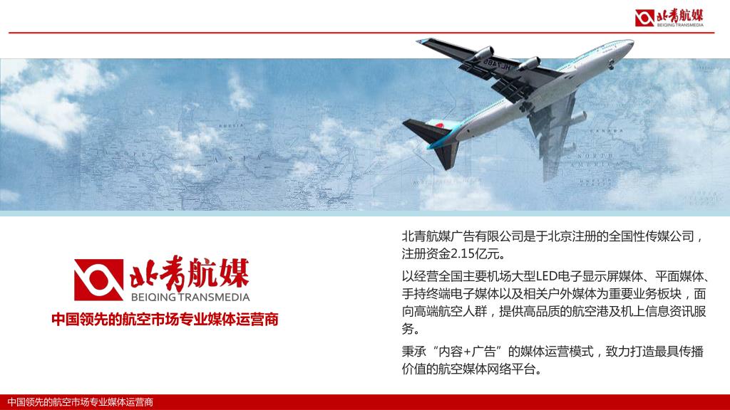 北青航媒广告有限公司是于北京注册的全国性传媒公司,注册资金2.15亿元。北青航媒广告有限公司是于北京注册的全国性传媒公司,注册资金2.15亿元。 以经营全国主要机场大型LED电子显示屏媒体、平面媒体、手持终端电子媒体以及相关户外媒体为重要业务板块,面向高端航空人群,提供高品质的航空港及机上信息资讯服务。 秉承“内容+广告”的媒体运营模式,致力打造最具传播价值的航空媒体网络平台。 中国领先的航空市场专业媒体运营商