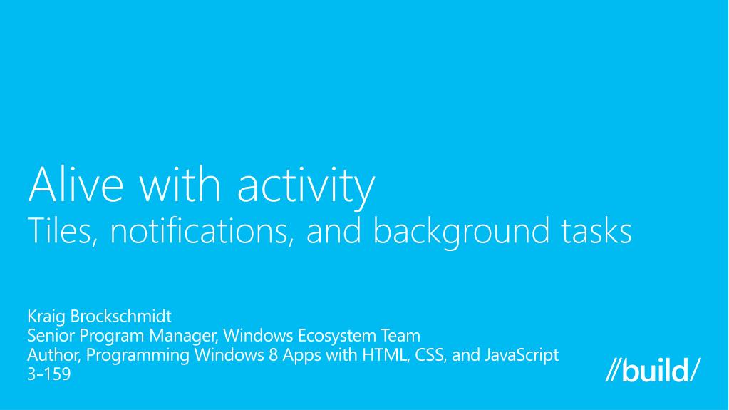 Alive with activityTiles, notifications, and background tasks Kraig Brockschmidt Senior Program Manager, Windows Ecosystem Team Author, Programming Windows 8 Apps with HTML, CSS, and JavaScript 3-159