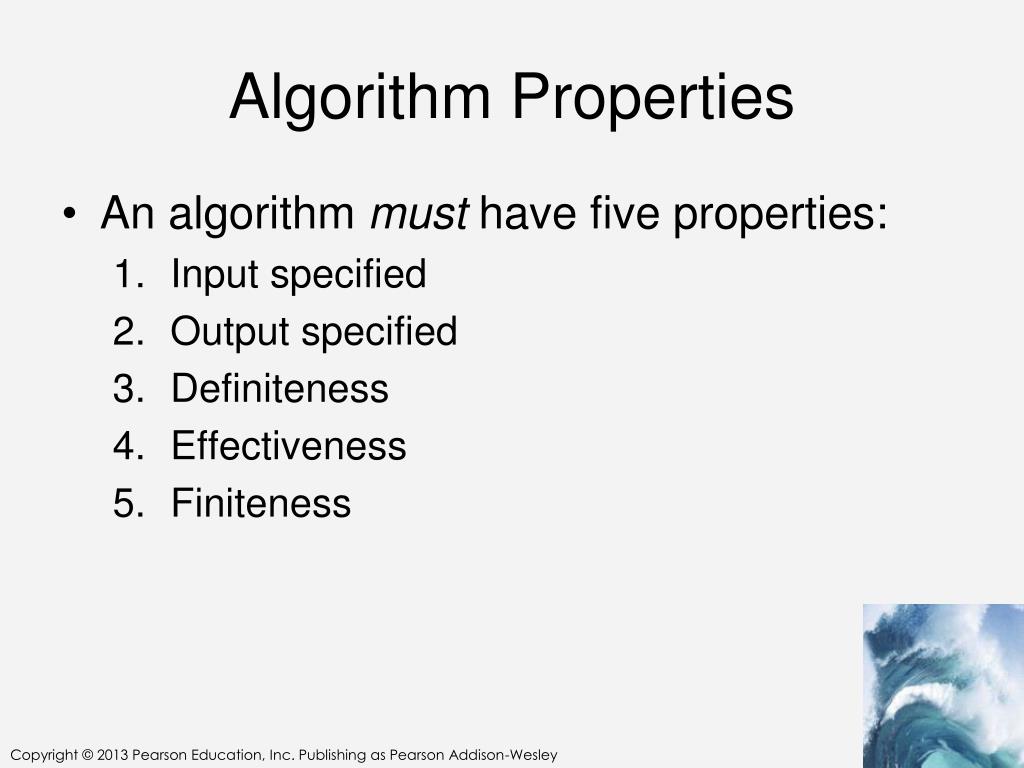 Learning Objectives. List the five essential properties of an algorithm Explain similarities and differences among algorithms, programs, and heuristic solutions Use the Intersect Alphabetized List algorithm to do the following: Follow the flow of the instruction execution