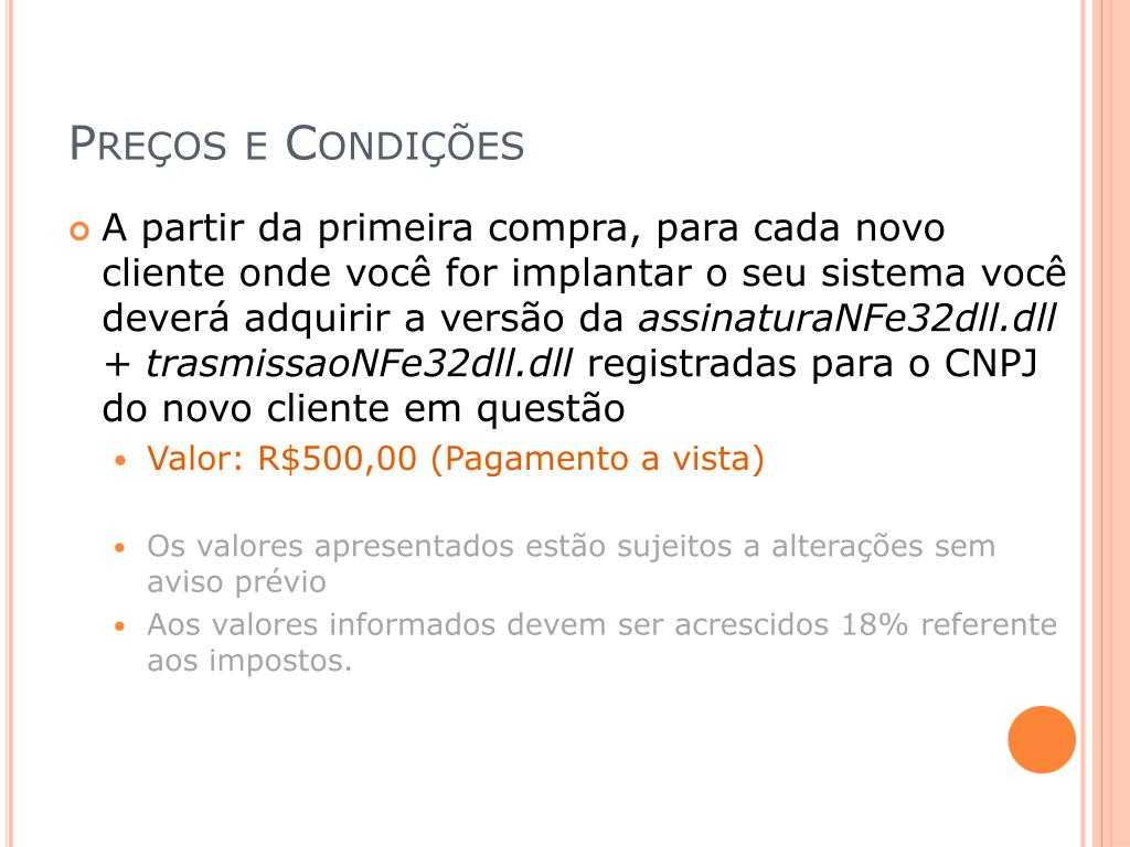 Preços e Condições • A partir da primeira compra, para cada novo cliente onde você for implantar o seu sistema você deverá adquirir a versão da assinaturaNFe32dll.dll + trasmissaoNFe32dll.dll registradas para o CNPJ do novo cliente em questão • Valor: R$500,00 (Pagamento a vista) • Os valores apresentados estão sujeitos a alterações sem aviso prévio • Aos valores informados devem ser acrescidos 18% referente aos impostos.