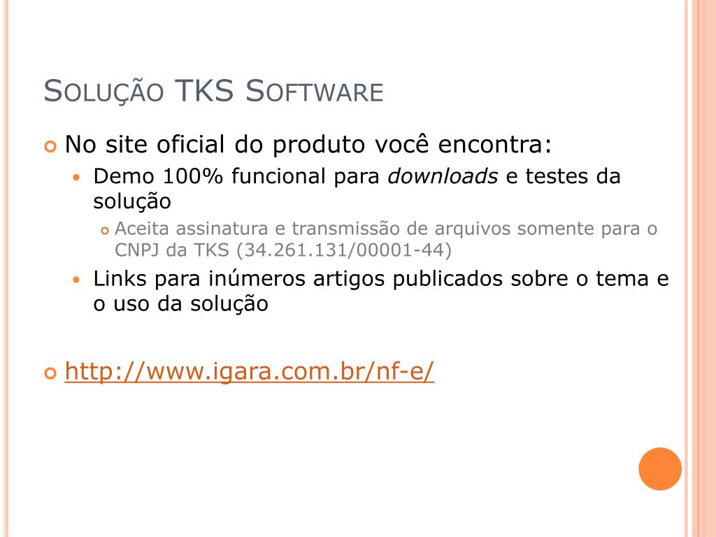 Solução TKS Software • No site oficial do produto você encontra: • Demo 100% funcional para downloads e testes da solução • Aceita assinatura e transmissão de arquivos somente para o CNPJ da TKS (34.261.131/00001-44) • Links para inúmeros artigos publicados sobre o tema e o uso da solução • http://www.igara.com.br/nf-e/