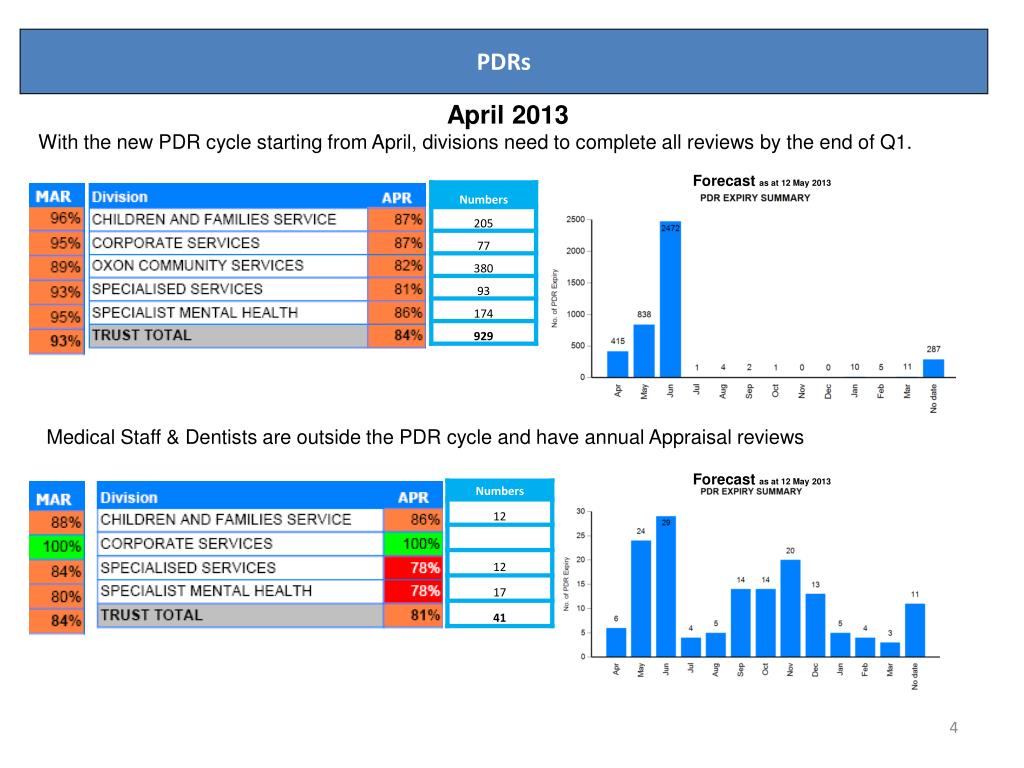 PDRs April 2013 With the new PDR cycle starting from April, divisions need to complete all reviews by the end of Q1. Forecast as at 12 May 2013 Medical Staff & Dentists are outside the PDR cycle and have annual Appraisal reviews Forecast as at 12 May 2013
