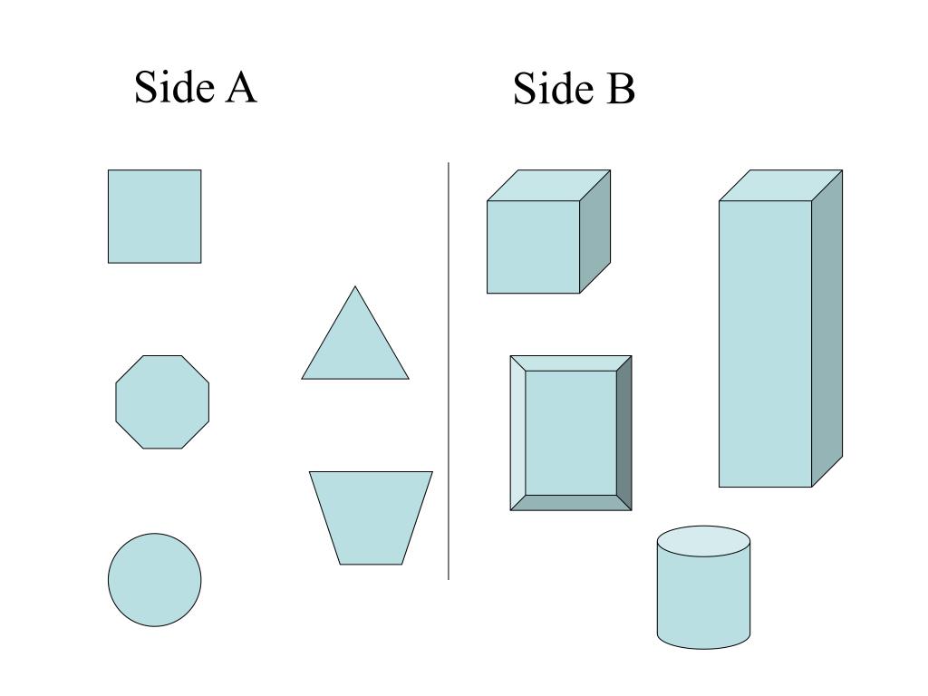 A B Nouns Verbs Biotic Abiotic Addition Subtraction Simile Metaphor Socialism Capitalism Abstract Realism 2 D 3D A B Triangles All other shapes Cars Trains, Buses etc Democracy Other forms Solids Liquids & Gases Translucent Opaque & Transp. Teasing Others forms of B Chemical Other types of Change Change Dichotomous Non Dichotmous