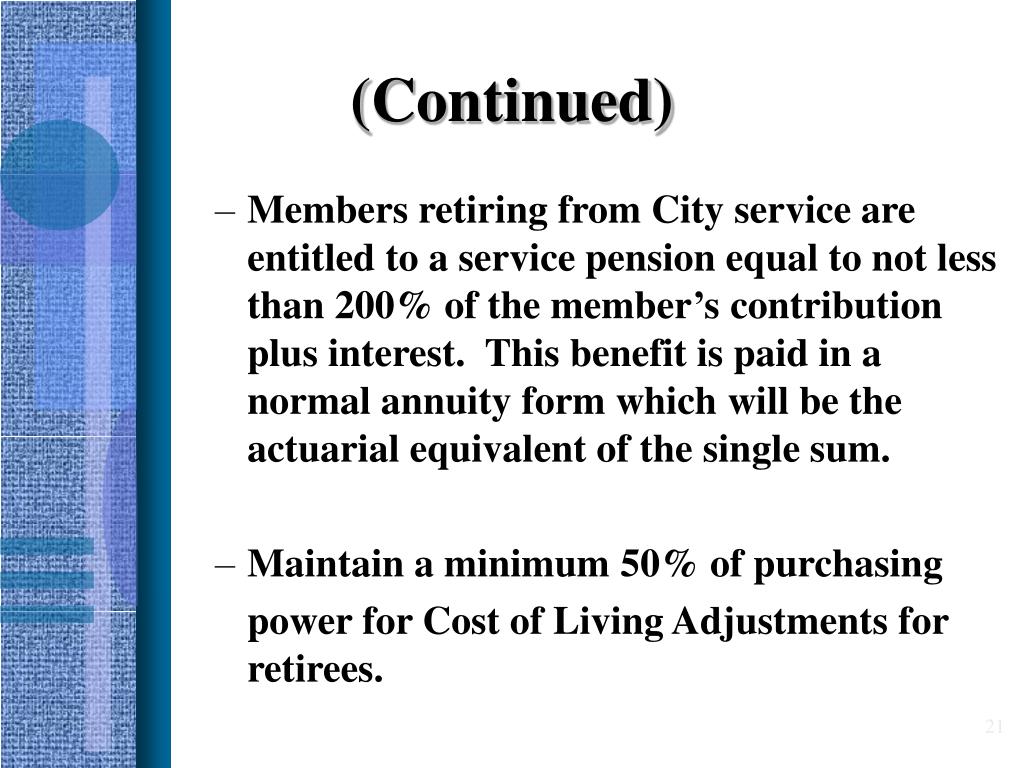 (Continued) • Members retiring from City service are entitled to a service pension equal to not less than 200% of the member’s contribution plus interest. This benefit is paid in a normal annuity form which will be the actuarial equivalent of the single sum. • Maintain a minimum 50% of purchasing power for Cost of Living Adjustments for retirees.