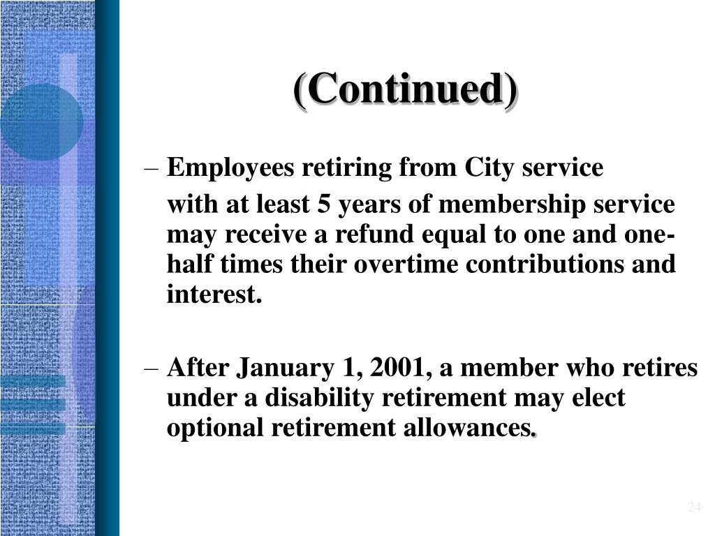 (Continued) • Employees retiring from City service with at least 5 years of membership service may receive a refund equal to one and one-half times their overtime contributions and interest. • After January 1, 2001, a member who retires under a disability retirement may elect optional retirement allowances.