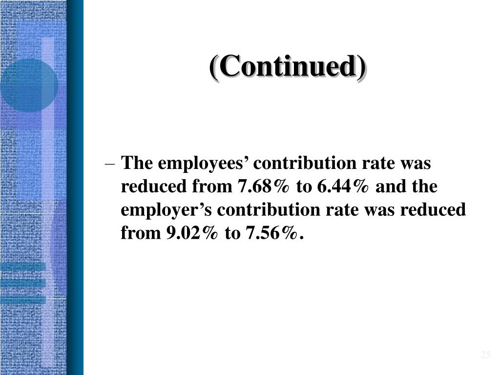 (Continued) • The employees’ contribution rate was reduced from 7.68% to 6.44% and the employer’s contribution rate was reduced from 9.02% to 7.56%.