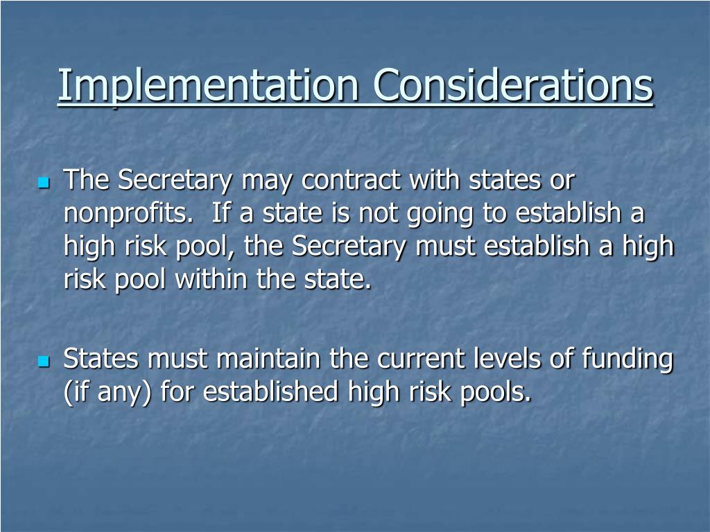 Implementation Considerations • The Secretary may contract with states or nonprofits. If a state is not going to establish a high risk pool, the Secretary must establish a high risk pool within the state. • States must maintain the current levels of funding (if any) for established high risk pools.