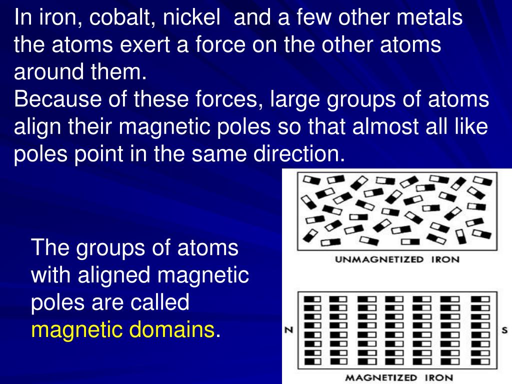 In iron, cobalt, nickel and a few other metals the atoms exert a force on the other atoms around them. Because of these forces, large groups of atoms align their magnetic poles so that almost all like poles point in the same direction. The groups of atoms with aligned magnetic poles are called magnetic domains.
