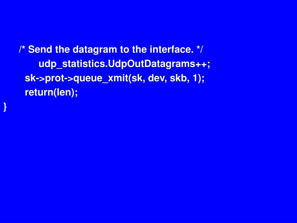 UDP Implementation: Source Codelinux implementation of UDP send side /* udp_send called from above, as result of sendto system call */ static int udp_send(struct sock *sk, struct sockaddr_in *sin, unsigned char *from, int len, int rt) { struct sk_buff *skb; struct device *dev; struct udphdr *uh; unsigned char *buff; unsigned long saddr; int size, tmp; int ttl;