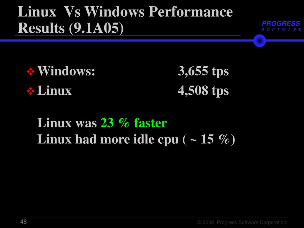 Digression:Linux Vs. Windows Performance In a previous benchmark, we compared Linuxagainst Windows • Progress 9.1A05 • Windows 2000 Advanced Server @$3,500 USD • RedHat Linux 6.2, 2.2.14 kernel • Same exact hardware for both • IBM Netfinity 8500, 8 x 550 mhz Pentium III • 8 gigabytes RAM • 40 x 9 Gigabyte SCSI disks • 32 megabytes of disk cache