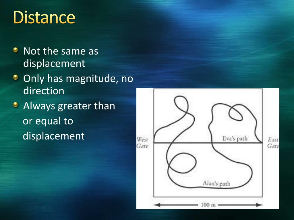 Distance • Not the same as displacement • Only has magnitude, no direction • Always greater than or equal to displacement