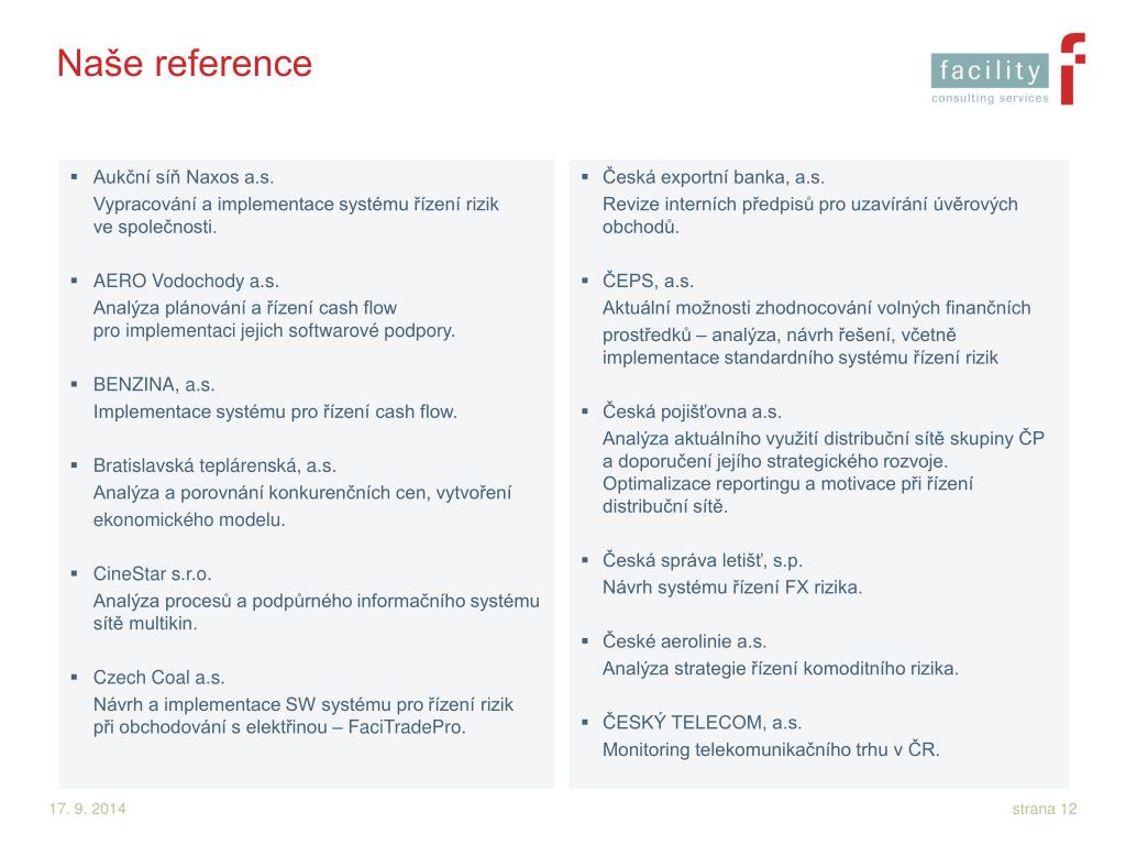 Naše reference Aukční síň Naxos a.s. Vypracování a implementace systému řízení rizik ve společnosti. AERO Vodochody a.s. Analýza plánování a řízení cash flow pro implementaci jejich softwarové podpory. BENZINA, a.s. Implementace systému pro řízení cash flow. Bratislavská teplárenská, a.s. Analýza a porovnání konkurenčních cen, vytvoření ekonomického modelu. CineStar s.r.o. Analýza procesů a podpůrného informačního systému sítě multikin. Czech Coal a.s. Návrh a implementace SW systému pro řízení rizik při obchodování s elektřinou – FaciTradePro. Česká exportní banka, a.s. Revize interních předpisů pro uzavírání úvěrových obchodů. ČEPS, a.s. Aktuální možnosti zhodnocování volných finančních prostředků – analýza, návrh řešení, včetně implementace standardního systému řízení rizik Česká pojišťovna a.s. Analýza aktuálního využití distribuční sítě skupiny ČP a doporučení jejího strategického rozvoje. Optimalizace reportingu a motivace při řízení distribuční sítě. Česká správa letišť, s.p. Návrh systému řízení FX rizika. České aerolinie a.s. Analýza strategie řízení komoditního rizika. ČESKÝ TELECOM, a.s. Monitoring telekomunikačního trhu v ČR.