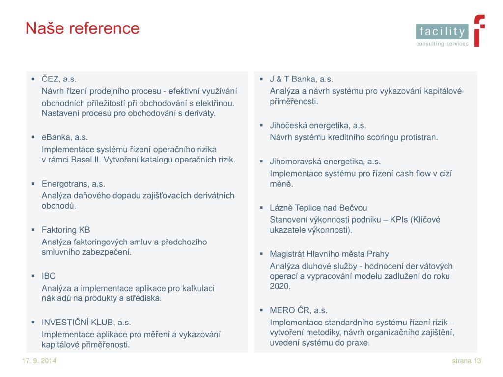 Naše reference ČEZ, a.s. Návrh řízení prodejního procesu - efektivní využívání obchodních příležitostí při obchodování s elektřinou. Nastavení procesů pro obchodování s deriváty. eBanka, a.s. Implementace systému řízení operačního rizika v rámci Basel II. Vytvoření katalogu operačních rizik. Energotrans, a.s. Analýza daňového dopadu zajišťovacích derivátních obchodů. Faktoring KB Analýza faktoringových smluv a předchozího smluvního zabezpečení. IBC Analýza a implementace aplikace pro kalkulaci nákladů na produkty a střediska. INVESTIČNÍ KLUB, a.s. Implementace aplikace pro měření a vykazování kapitálové přiměřenosti. J & T Banka, a.s. Analýza a návrh systému pro vykazování kapitálové přiměřenosti. Jihočeská energetika, a.s. Návrh systému kreditního scoringu protistran. Jihomoravská energetika, a.s. Implementace systému pro řízení cash flow v cizí měně. Lázně Teplice nad Bečvou Stanovení výkonnosti podniku – KPIs (Klíčové ukazatele výkonnosti). Magistrát Hlavního města Prahy Analýza dluhové služby - hodnocení derivátových operací a vypracování modelu zadlužení do roku 2020. MERO ČR, a.s. Implementace standardního systému řízení rizik – vytvoření metodiky, návrh organizačního zajištění, uvedení systému do praxe.
