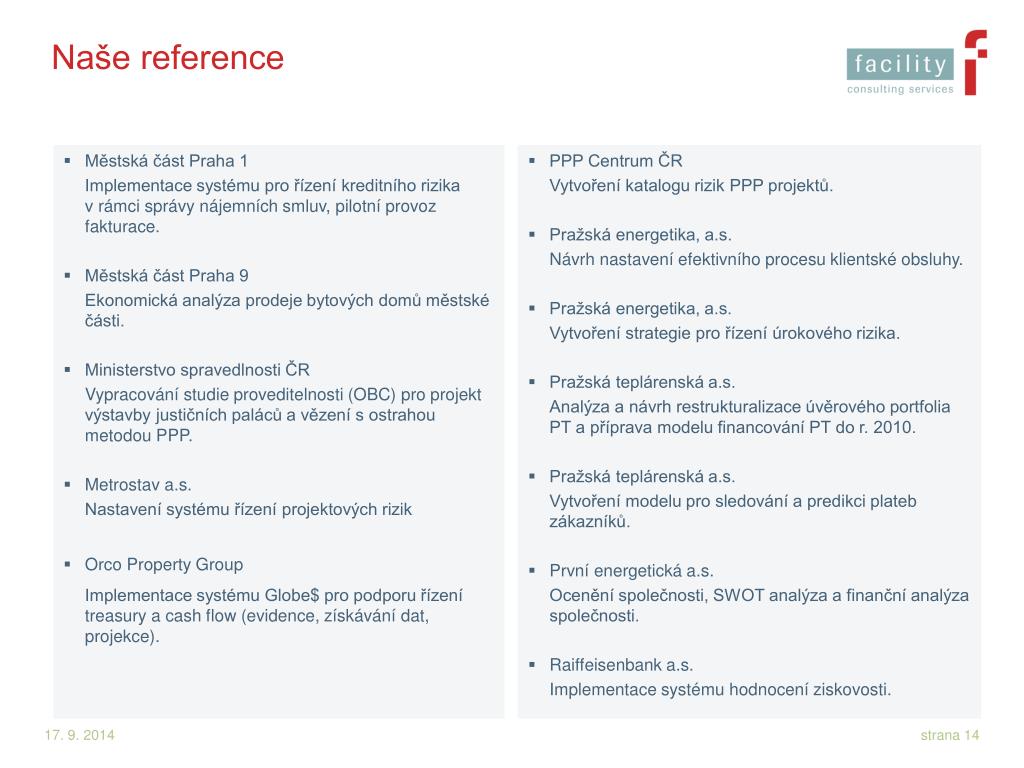Naše reference Městská část Praha 1 Implementace systému pro řízení kreditního rizika v rámci správy nájemních smluv, pilotní provoz fakturace. Městská část Praha 9 Ekonomická analýza prodeje bytových domů městské části. Ministerstvo spravedlnosti ČR Vypracování studie proveditelnosti (OBC) pro projekt výstavby justičních paláců a vězení s ostrahou metodou PPP. Metrostav a.s. Nastavení systému řízení projektových rizik Orco Property Group Implementace systému Globe$ pro podporu řízení treasury a cash flow (evidence, získávání dat, projekce). PPP Centrum ČR Vytvoření katalogu rizik PPP projektů. Pražská energetika, a.s. Návrh nastavení efektivního procesu klientské obsluhy. Pražská energetika, a.s. Vytvoření strategie pro řízení úrokového rizika. Pražská teplárenská a.s. Analýza a návrh restrukturalizace úvěrového portfolia PT a příprava modelu financování PT do r. 2010. Pražská teplárenská a.s. Vytvoření modelu pro sledování a predikci plateb zákazníků. První energetická a.s. Ocenění společnosti, SWOT analýza a finanční analýza společnosti. Raiffeisenbank a.s. Implementace systému hodnocení ziskovosti.