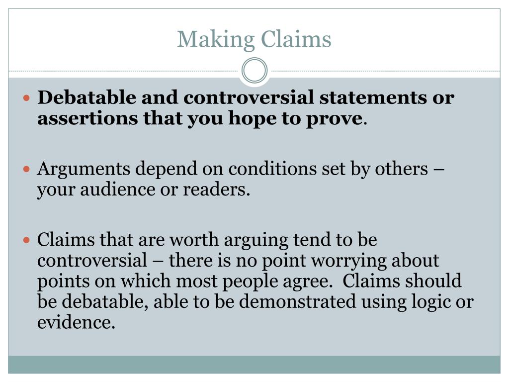 Making Claims • Debatable and controversial statements or assertions that you hope to prove. • Arguments depend on conditions set by others – your audience or readers. • Claims that are worth arguing tend to be controversial – there is no point worrying about points on which most people agree. Claims should be debatable, able to be demonstrated using logic or evidence.