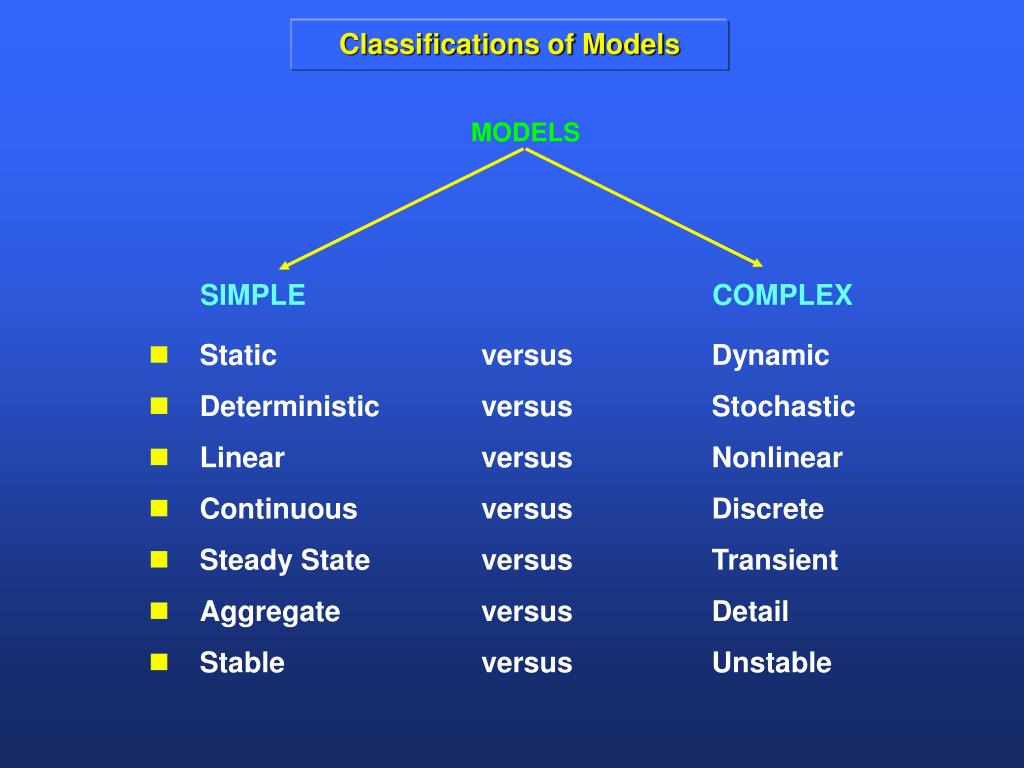 Classifications of Models • Static versus Dynamic • Deterministic versus Stochastic • Linear versus Nonlinear • Continuous versus Discrete • Steady State versus Transient • Aggregate versus Detail • Stable versus Unstable MODELS SIMPLECOMPLEX
