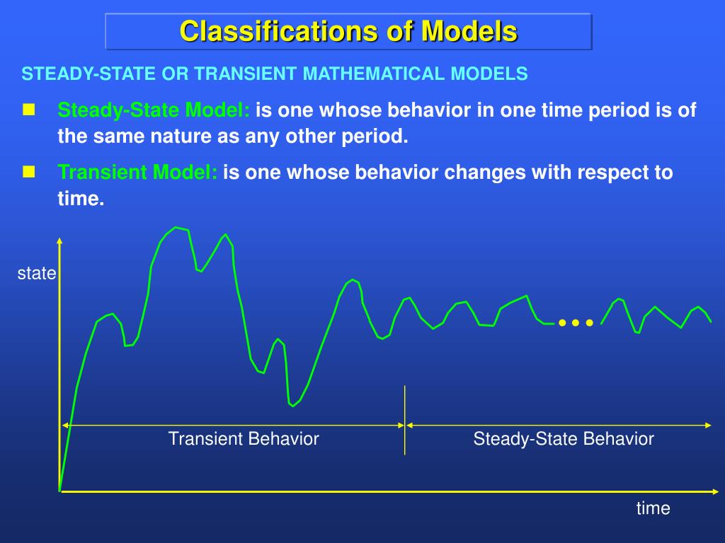Classifications of Models STEADY-STATE OR TRANSIENT MATHEMATICAL MODELS • Steady-State Model: is one whose behavior in one time period is of the same nature as any other period. • Transient Model: is one whose behavior changes with respect to time. state Transient Behavior Steady-State Behavior time