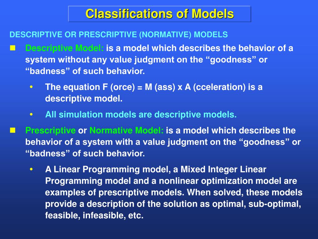 Classifications of Models DESCRIPTIVE OR PRESCRIPTIVE (NORMATIVE) MODELS • Descriptive Model: is a model which describes the behavior of a system without any value judgment on the “goodness” or “badness” of such behavior. • The equation F (orce) = M (ass) x A (cceleration) is a descriptive model. • All simulation models are descriptive models. • Prescriptive or Normative Model: is a model which describes the behavior of a system with a value judgment on the “goodness” or “badness” of such behavior. • A Linear Programming model, a Mixed Integer Linear Programming model and a nonlinear optimization model are examples of prescriptive models. When solved, these models provide a description of the solution as optimal, sub-optimal, feasible, infeasible, etc.