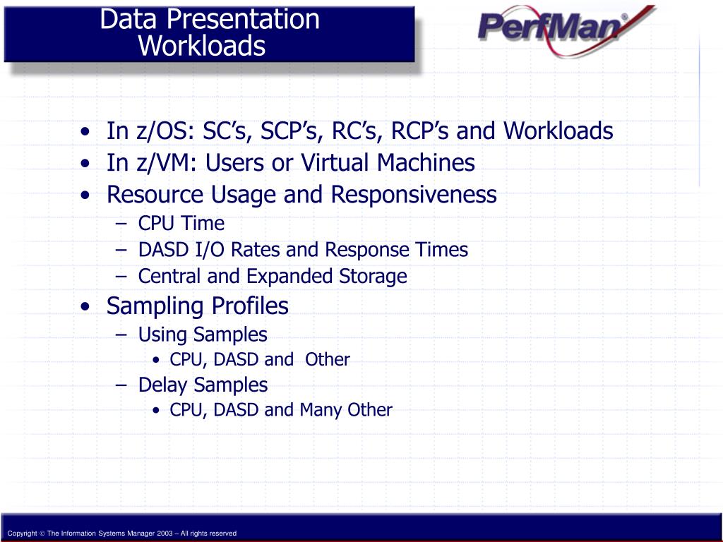 Data PresentationWorkloads • In z/OS: SC’s, SCP’s, RC’s, RCP’s and Workloads • In z/VM: Users or Virtual Machines • Resource Usage and Responsiveness • CPU Time • DASD I/O Rates and Response Times • Central and Expanded Storage • Sampling Profiles • Using Samples • CPU, DASD and Other • Delay Samples • CPU, DASD and Many Other