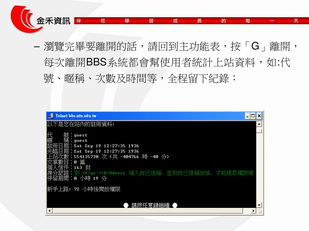 瀏覽BBS站 • 登入BBS站有一些專用的軟體,例如:KKman就頗受歡迎,您可以運用FTP檔案傳輸下載該軟體,不過Windows本身就提供了Telnet上站功能,我們以台灣大學的BBS站為例來說明。