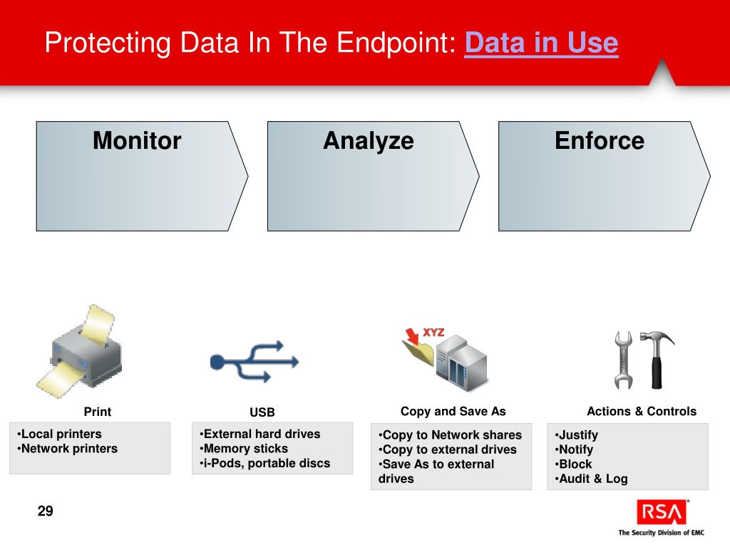 Protecting Data In The Endpoint: Data in Use Monitor Analyze Enforce Copy and Save As Actions & Controls Print USB • Local printers • Network printers • External hard drives • Memory sticks • i-Pods, portable discs • Copy to Network shares • Copy to external drives • Save As to external drives • Justify • Notify • Block • Audit & Log 29