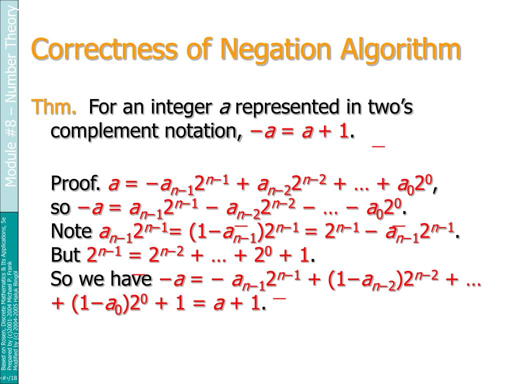 Correctness of Negation Algorithm • Thm.For an integer a represented in two’s complement notation, −a = a + 1. • Proof.a = −an−12n−1 + an−22n−2 + … + a020, so −a = an−12n−1 − an−22n−2 − … − a020. Note an−12n−1= (1−an−1)2n−1 = 2n−1 − an−12n−1. But 2n−1 = 2n−2 + … + 20 + 1. So we have −a = − an−12n−1 + (1−an−2)2n−2 + … + (1−a0)20 + 1 = a + 1.