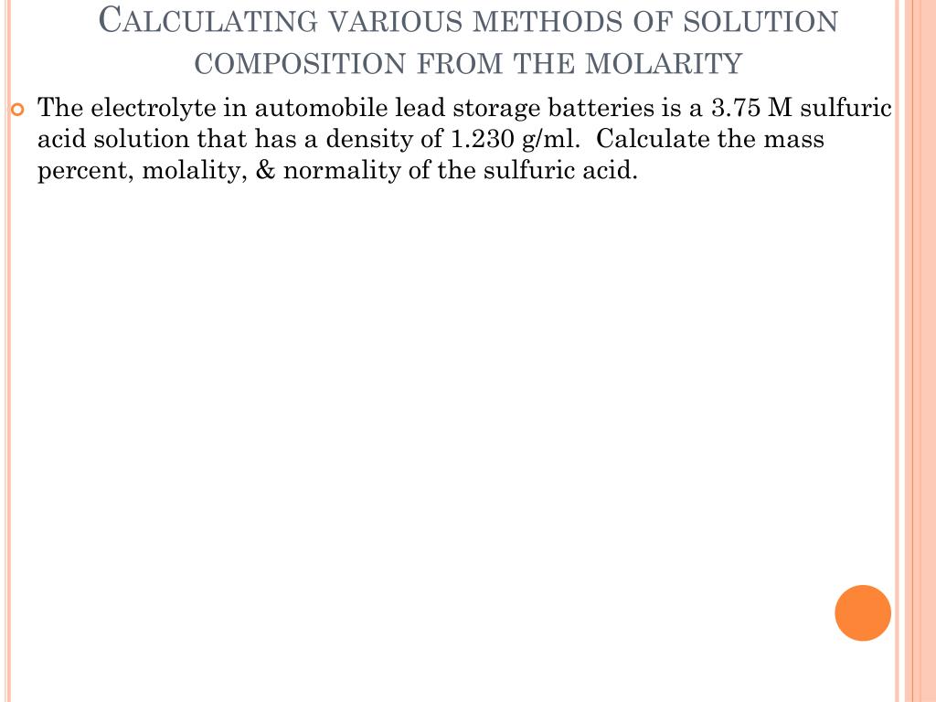Calculating various methods of solution composition from the molarity • The electrolyte in automobile lead storage batteries is a 3.75 M sulfuric acid solution that has a density of 1.230 g/ml. Calculate the mass percent, molality, & normality of the sulfuric acid.