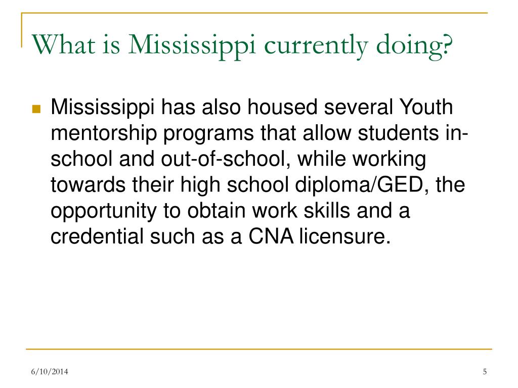 What is Mississippi currently doing? • Mississippi has also housed several Youth mentorship programs that allow students in-school and out-of-school, while working towards their high school diploma/GED, the opportunity to obtain work skills and a credential such as a CNA licensure.