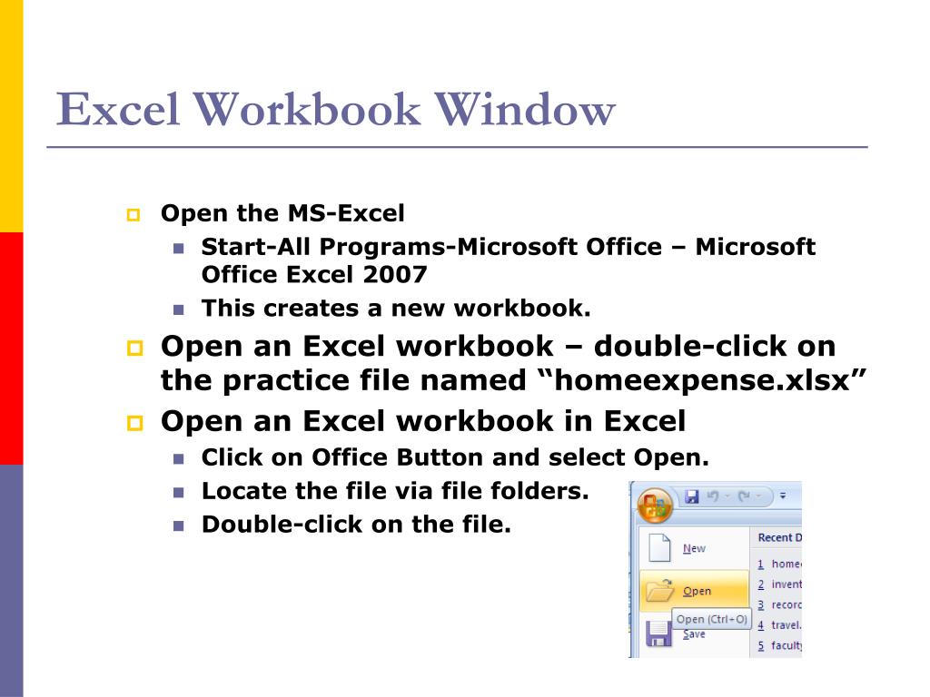 Excel Workbook Window • Open the MS-Excel • Start-All Programs-Microsoft Office – Microsoft Office Excel 2007 • This creates a new workbook. • Open an Excel workbook – double-click on the practice file named “homeexpense.xlsx” • Open an Excel workbook in Excel • Click on Office Button and select Open. • Locate the file via file folders. • Double-click on the file.