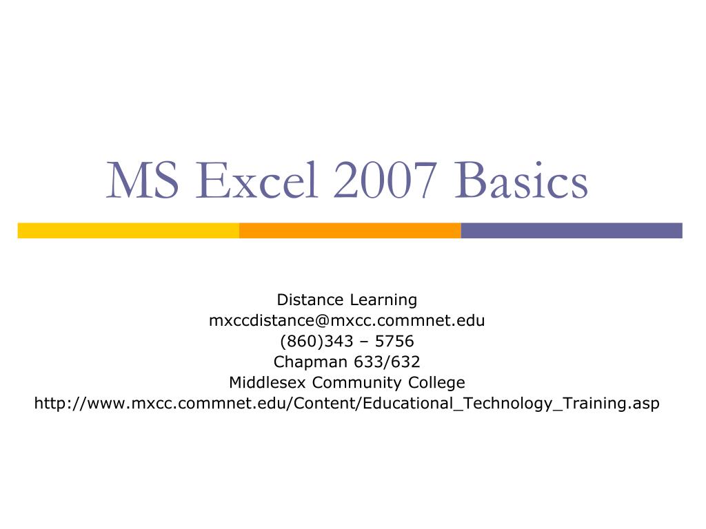 MS Excel 2007 Basics . Distance Learning mxccdistance@mxcc.commnet.edu (860)343 – 5756 Chapman 633/632 Middlesex Community College http://www.mxcc.commnet.edu/Content/Educational_Technology_Training.asp. MS Excel 2007 Basics. Explanation of key terms in MS Excel