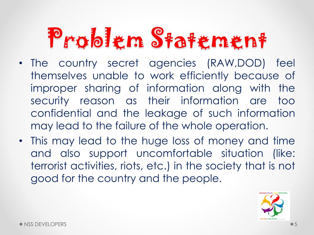 Problem Statement • The country secret agencies (RAW,DOD) feel themselves unable to work efficiently because of improper sharing of information along with the security reason as their information are too confidential and the leakage of such information may lead to the failure of the whole operation. • This may lead to the huge loss of money and time and also support uncomfortable situation (like: terrorist activities, riots, etc.) in the society that is not good for the country and the people. NSS DEVELOPERS