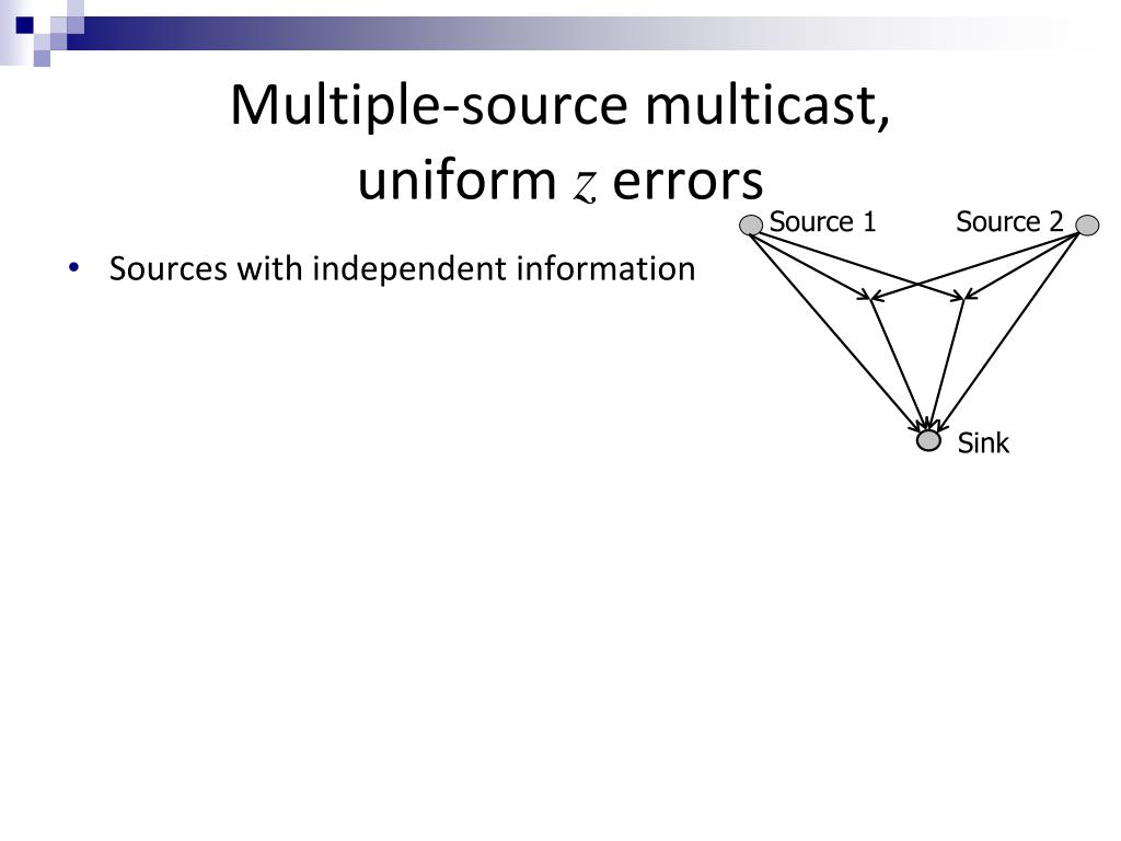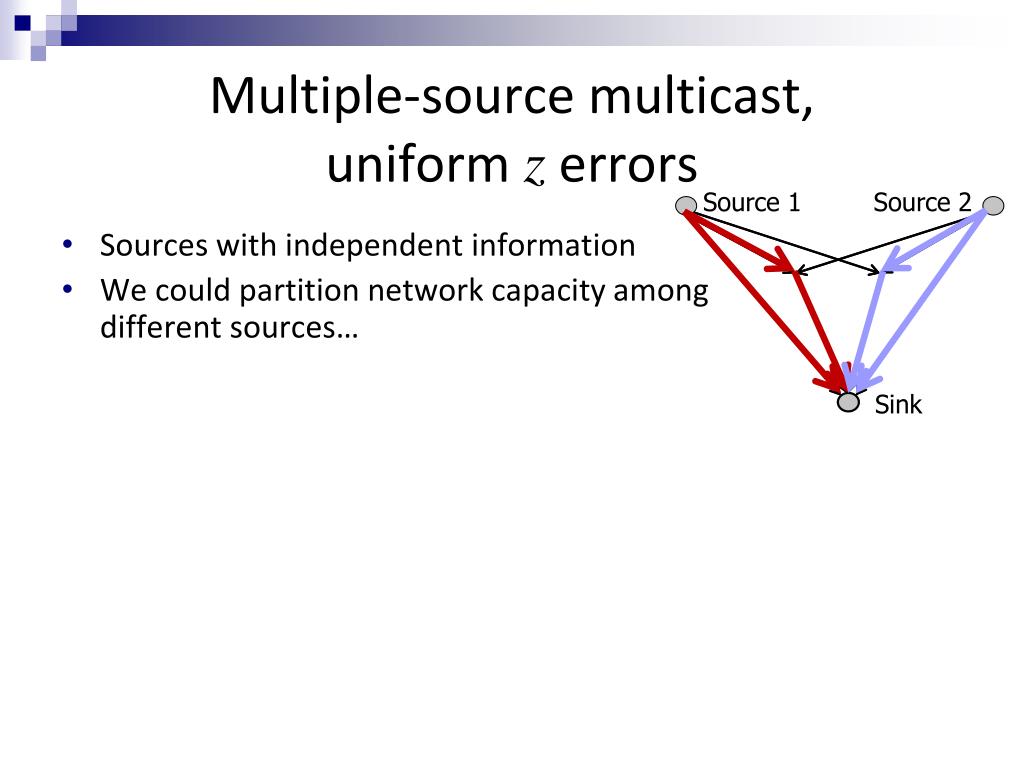 Multiple-source multicast,uniform z errors Source 1 Source 2 Sink Sources with independent information We could partition network capacity among different sources… But could rate be improved by coding across different sources in the network? To what extent can different sources share network capacity? Challenge: owing to the need for coding across sources in the network and independent encoding at sources, straightforward extensions of single-source codes are suboptimal Related work: code construction in (Siavoshani, Fragouli & Diggavi 08) achieves capacity for C1+C2=C