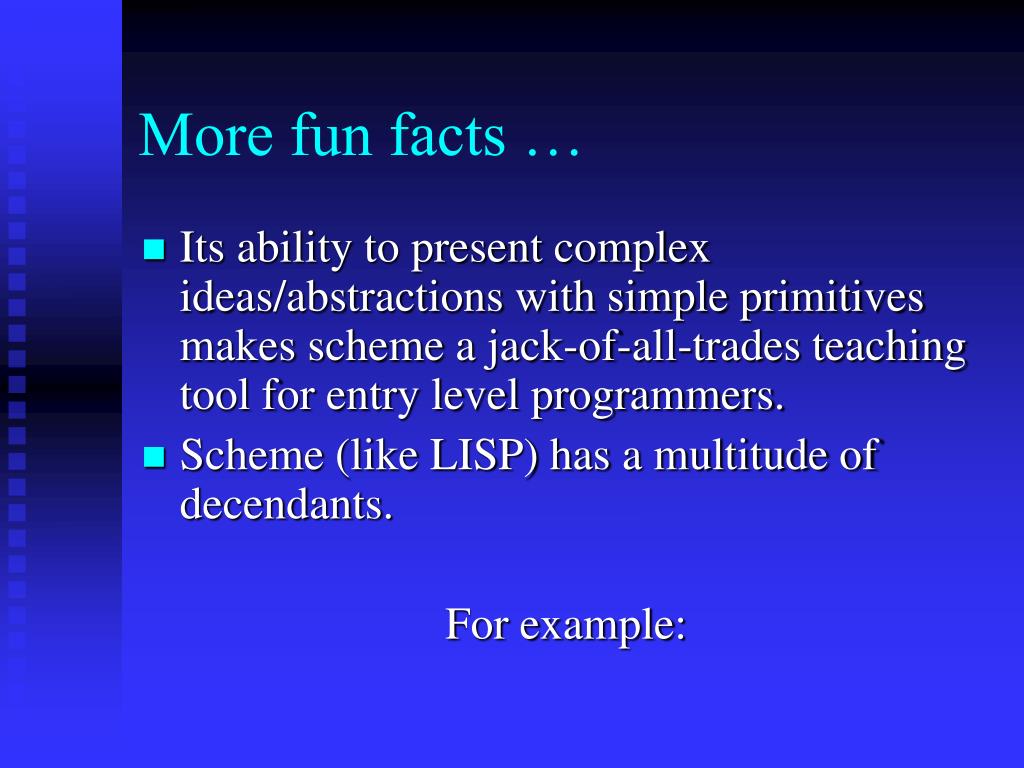 More fun facts … • Its ability to present complex ideas/abstractions with simple primitives makes scheme a jack-of-all-trades teaching tool for entry level programmers. • Scheme (like LISP) has a multitude of decendants. For example: