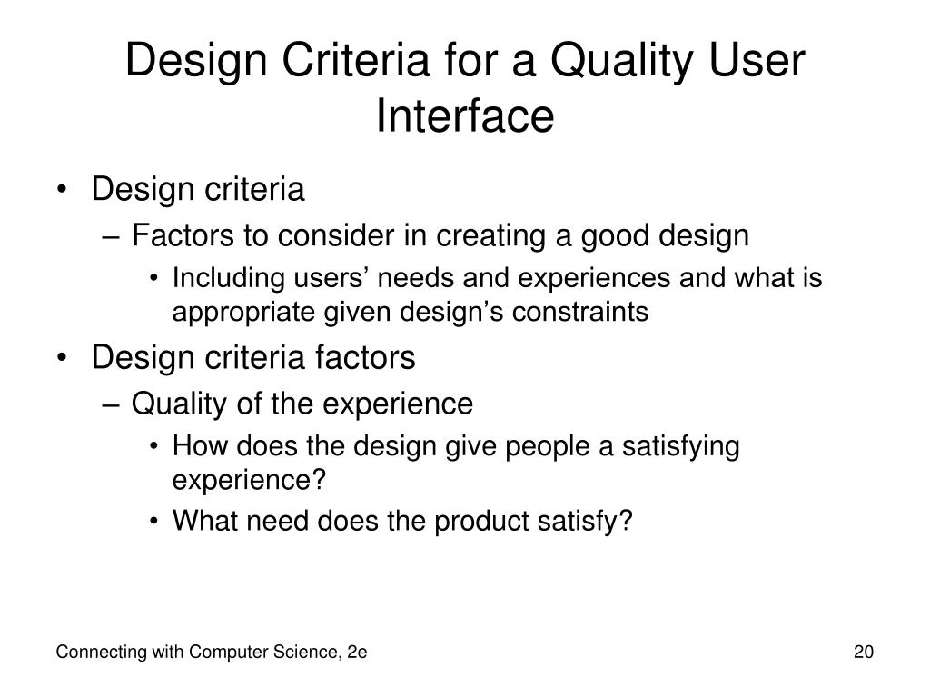 Design Criteria for a Quality User Interface • Design criteria • Factors to consider in creating a good design • Including users’ needs and experiences and what is appropriate given design’s constraints • Design criteria factors • Quality of the experience • How does the design give people a satisfying experience? • What need does the product satisfy? Connecting with Computer Science, 2e