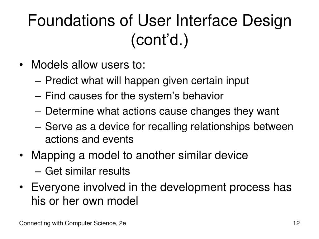 Foundations of User Interface Design (cont’d.) • Models allow users to: • Predict what will happen given certain input • Find causes for the system’s behavior • Determine what actions cause changes they want • Serve as a device for recalling relationships between actions and events • Mapping a model to another similar device • Get similar results • Everyone involved in the development process has his or her own model Connecting with Computer Science, 2e