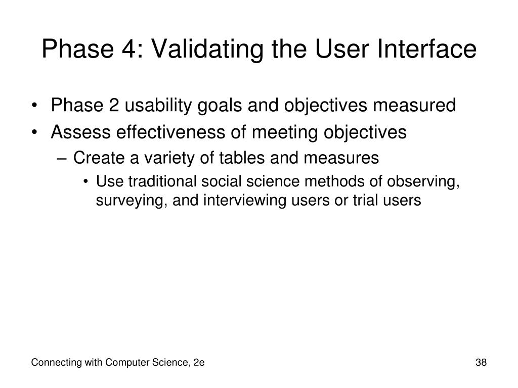 Phase 4: Validating the User Interface • Phase 2 usability goals and objectives measured • Assess effectiveness of meeting objectives • Create a variety of tables and measures • Use traditional social science methods of observing, surveying, and interviewing users or trial users Connecting with Computer Science, 2e