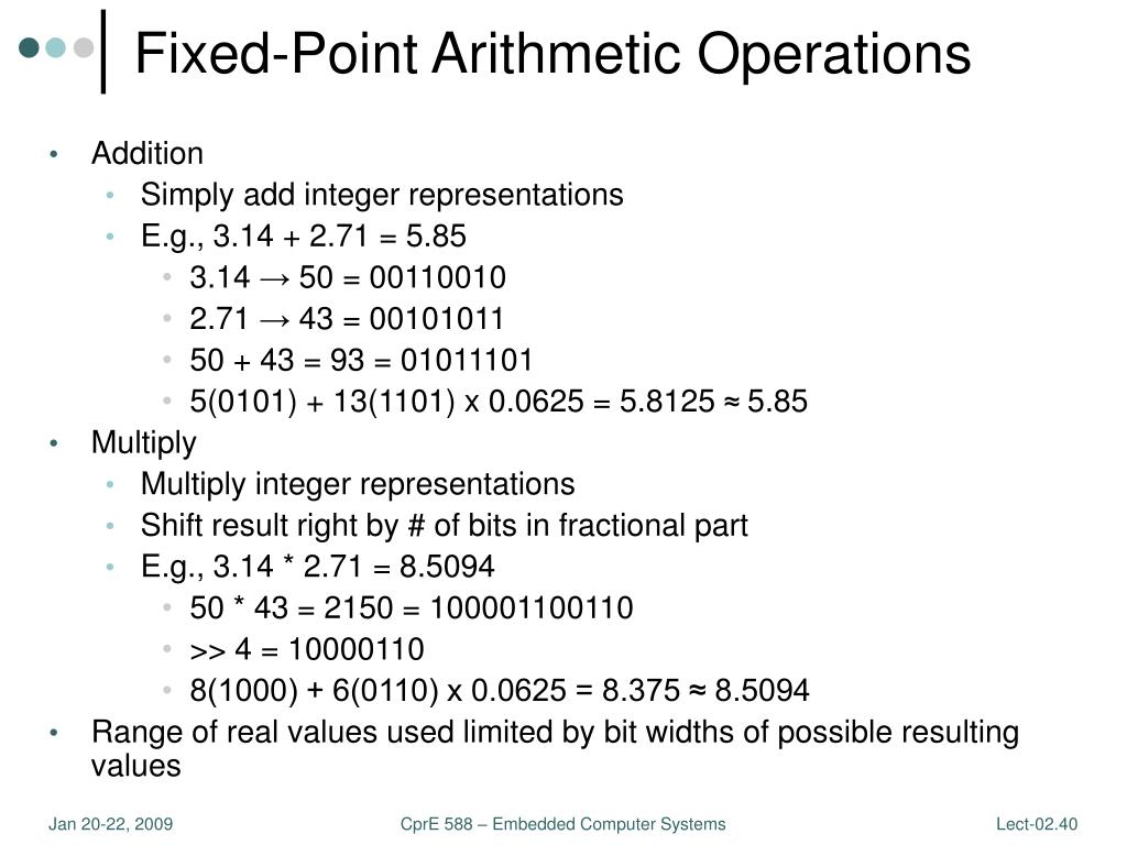 Fixed-Point Arithmetic Operations • Addition • Simply add integer representations • E.g., 3.14 + 2.71 = 5.85 • 3.14 → 50 = 00110010 • 2.71 → 43 = 00101011 • 50 + 43 = 93 = 01011101 • 5(0101) + 13(1101) x 0.0625 = 5.8125 ≈ 5.85 • Multiply • Multiply integer representations • Shift result right by # of bits in fractional part • E.g., 3.14 * 2.71 = 8.5094 • 50 * 43 = 2150 = 100001100110 • >> 4 = 10000110 • 8(1000) + 6(0110) x 0.0625 = 8.375 ≈ 8.5094 • Range of real values used limited by bit widths of possible resulting values CprE 588 – Embedded Computer Systems