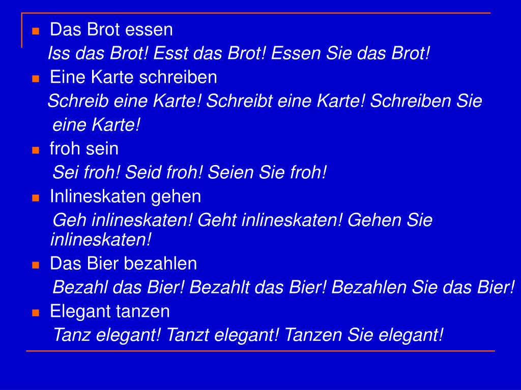 Das Brot essen Iss das Brot! Esst das Brot! Essen Sie das Brot! Eine Karte schreiben Schreib eine Karte! Schreibt eine Karte! Schreiben Sie eine Karte! froh sein Sei froh! Seid froh! Seien Sie froh! Inlineskaten gehen Geh inlineskaten! Geht inlineskaten! Gehen Sie inlineskaten! Das Bier bezahlen Bezahl das Bier! Bezahlt das Bier! Bezahlen Sie das Bier! Elegant tanzen Tanz elegant! Tanzt elegant! Tanzen Sie elegant!