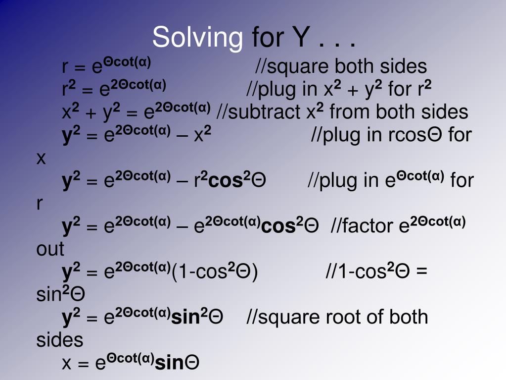 r = eΘcot(α) //square both sides r2 = e2Θcot(α) //plug in x2 + y2 for r2 x2 + y2 = e2Θcot(α)//subtract x2 from both sides y2= e2Θcot(α) – x2 //plug in rcosΘ for x y2 = e2Θcot(α) – r2cos2Θ //plug in eΘcot(α) for r y2 = e2Θcot(α) – e2Θcot(α)cos2Θ //factor e2Θcot(α) out y2 = e2Θcot(α)(1-cos2Θ) //1-cos2Θ = sin2Θ y2 = e2Θcot(α)sin2Θ //square root of both sides x = eΘcot(α)sinΘ Solving for Y . . .