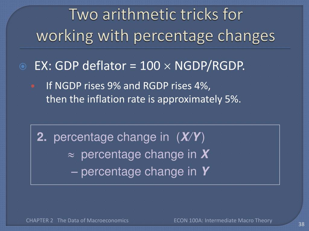 Two arithmetic tricks for working with percentage changes 1. For any variables X and Y, percentage change in (XY) percentage change in X+ percentage change in Y EX: If your hourly wage rises 5% and you work 7% more hours, then your wage income rises approximately 12%. CHAPTER 2 The Data of Macroeconomics