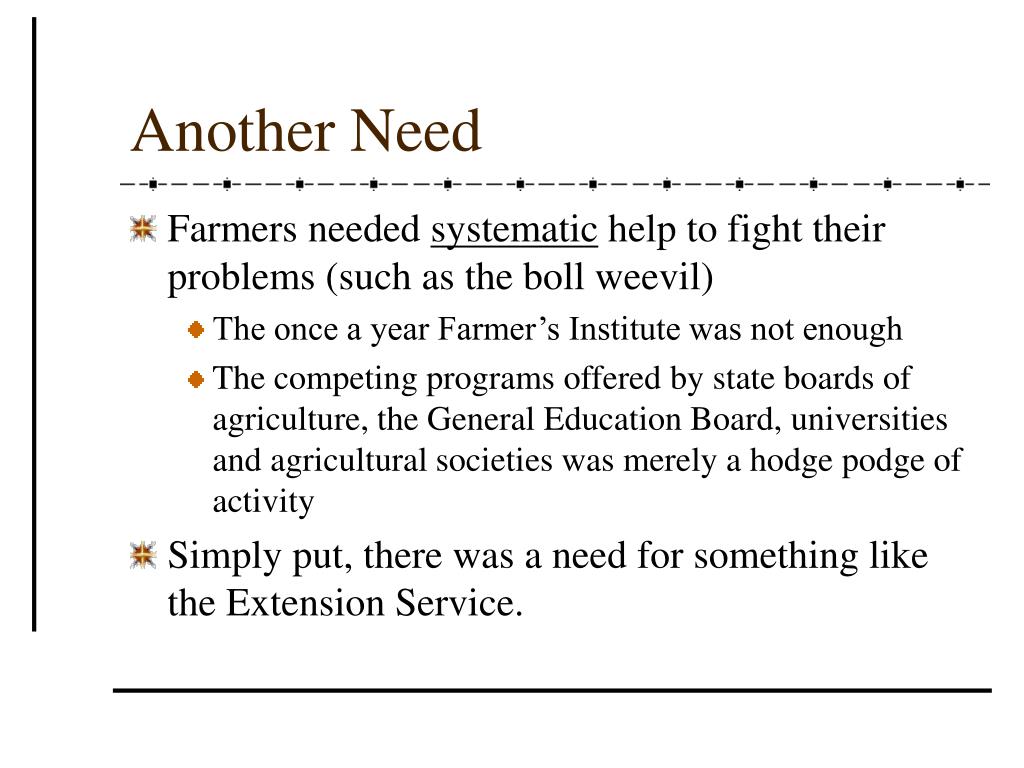 Another Need • Farmers needed systematic help to fight their problems (such as the boll weevil) • The once a year Farmer’s Institute was not enough • The competing programs offered by state boards of agriculture, the General Education Board, universities and agricultural societies was merely a hodge podge of activity • Simply put, there was a need for something like the Extension Service.