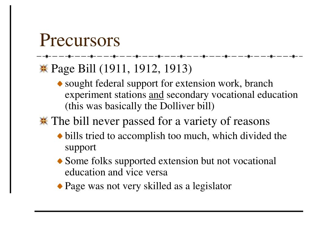Precursors • Page Bill (1911, 1912, 1913) • sought federal support for extension work, branch experiment stations and secondary vocational education (this was basically the Dolliver bill) • The bill never passed for a variety of reasons • bills tried to accomplish too much, which divided the support • Some folks supported extension but not vocational education and vice versa • Page was not very skilled as a legislator